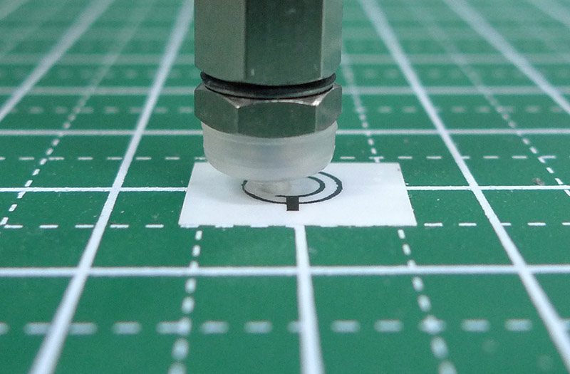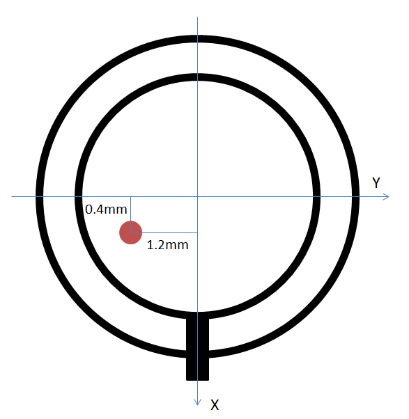 The red circle represents the center of the gripper, and the misalignment is such that shifting it by -0.4 mm in the X direction and +1.2 mm in the Y direction will bring it back to its intended center. ADJ_OFS seems to be responsible for correcting the center of the eccentric circle, so we set it to half the misalignment amount.